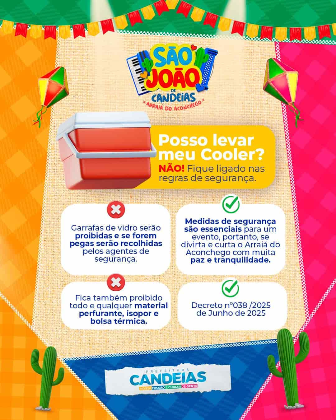 A ordem para o Arraiá do Aconchego 2025 é se divertir, mas com segurança. Para garantir a melhor experiência ao público candeense e aos visitantes que vão curtir a festa na Arena de Shows, no centro da cidade, a partir deste sábado (21), a Prefeitura divulgou um alerta sobre o que não é permitido levar para o local do evento.