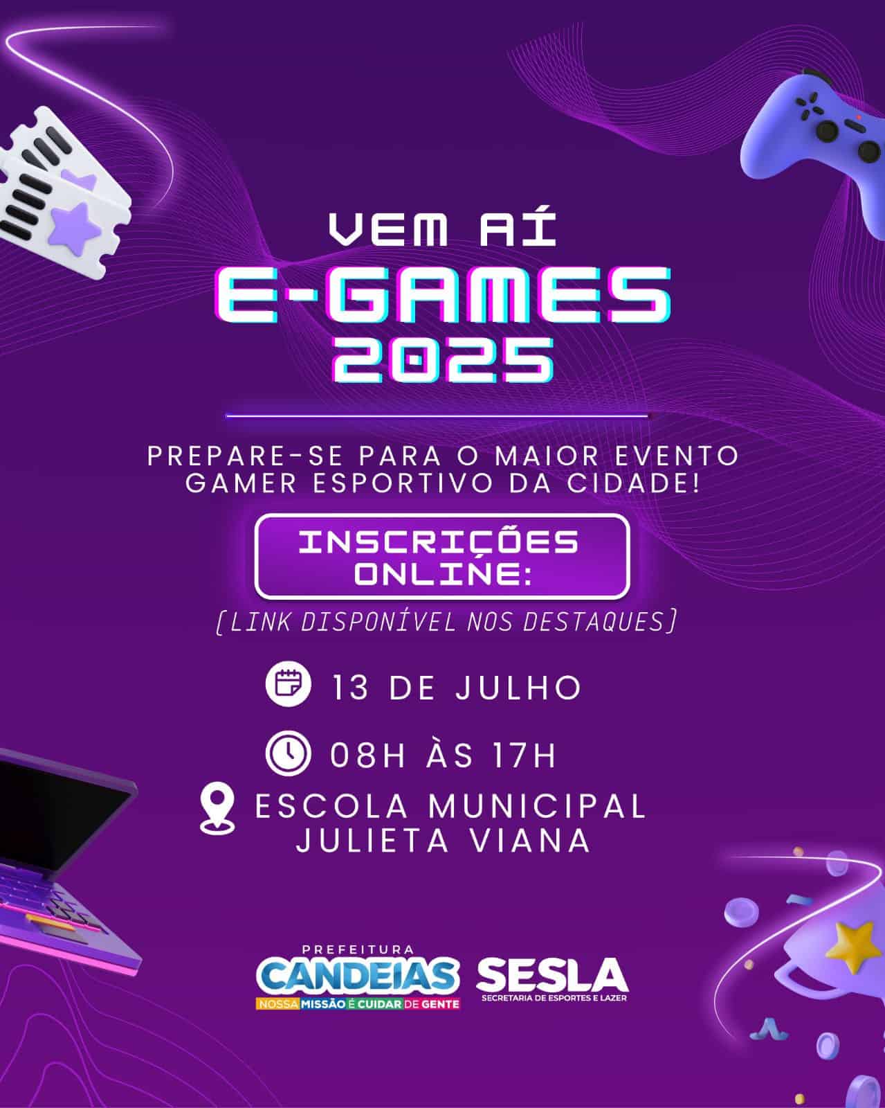 Estão abertas as inscrições para o E-Games, torneio de jogos eletrônicos realizado pela Prefeitura de Candeias, por meio da Secretaria de Esporte, Lazer e Juventude (SESLA).