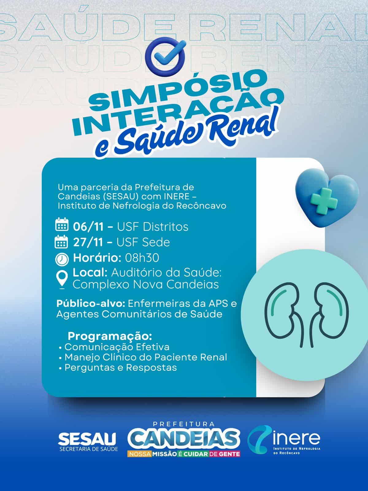 O evento, promovido pela Prefeitura de Candeias, por meio da Secretaria de Saúde (SESAU), em parceria com o Instituto de Nefrologia do Recôncavo (INERE), será realizado no auditório do Complexo da Nova Candeias, a partir das 8h30.